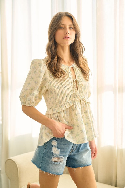 Floral pleated front tie ruffled top with short puff sleeves is a flirty and effortless piece, perfect for spring and summer, including Mother's Day. Its feminine design and comfortable fit make it a must-have addition to your wardrobe.
